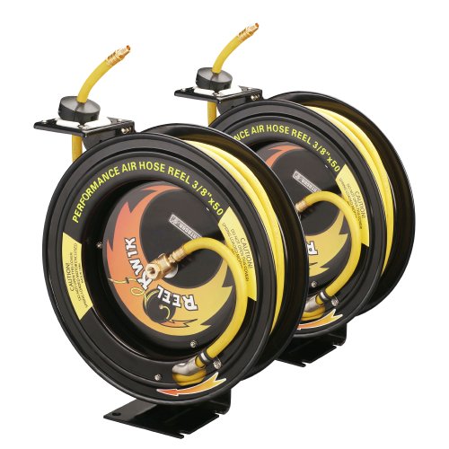 - Heavy duty base and reel mounts to any wall, ceiling, or work bench and holds 50\' of 3/8\" rubber hose